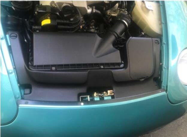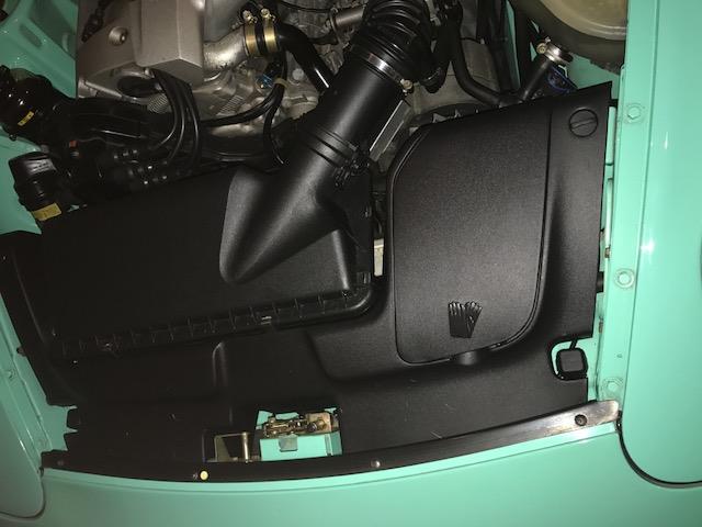 Engine compartment glove box – We have three versions of this application for our 968s. When 968s began production they had a thoughtful glove box unit in the engine compartment that contained cloth gloves and a rag in special zip-lock bags. The piece looked great and, combined with the rear cover piece, cleaned up the 968 engine compartment so it looked even better. The first minor change appears to have happened around May of the 1992 model year with the removal of the raised gloves from the glove box door. The September 1991 produced Minty has the gloves shown on the door of the glove box. The June 1992 produced Matador does not. So you’ll find the gloved door from 9/91 – 5/92 and the no-gloved door from 6/92 – 6/93. When the mid-year 94 changes appeared on the 968 in July of 1993 the engine trim pieces had been removed and continued that way until the end of production.